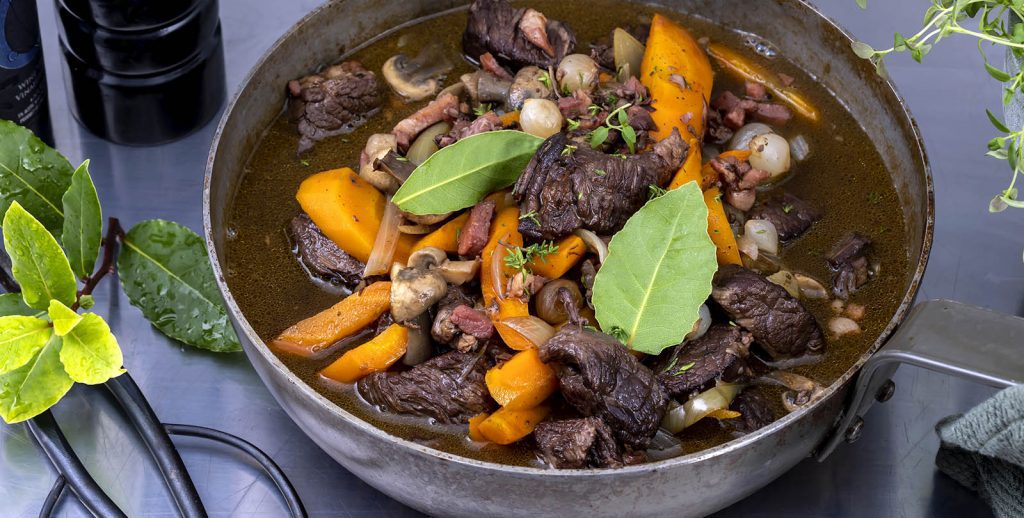 Bouef Bourguignon är en favorit som äts över hela världen och som finns i mängder varianter. Vad de dock har gemensamt är att nästan alla görs på nötkött, gärna högrev, det vil säga den styckningsdetalj av nötkött som kommer från oxens kraftiga hals ner mot bogen. Rätt tillagad och med rätt fond blir grytan mustig och god innehållandes ett smakrikt kött med bra konsistens.