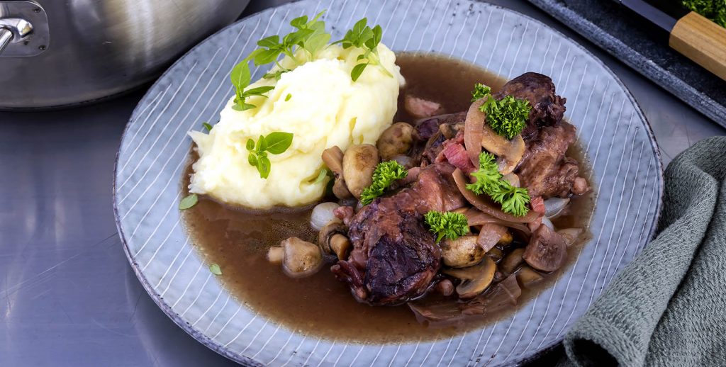 Bouef Bourguignon är en favorit som äts över hela världen och som finns i mängder varianter. Vad de dock har gemensamt är att nästan alla görs på nötkött, gärna högrev, det vil säga den styckningsdetalj av nötkött som kommer från oxens kraftiga hals ner mot bogen. Rätt tillagad och med rätt fond blir grytan mustig och god innehållandes ett smakrikt kött med bra konsistens.